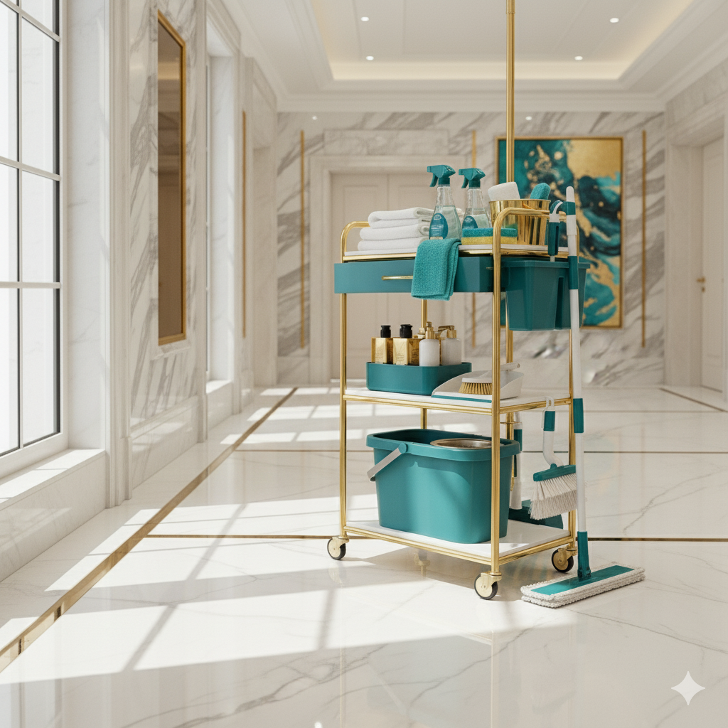A gold and turquoise cleaning cart filled with supplies, including a bucket, bottles, and towels, sits in a luxurious marble hallway.