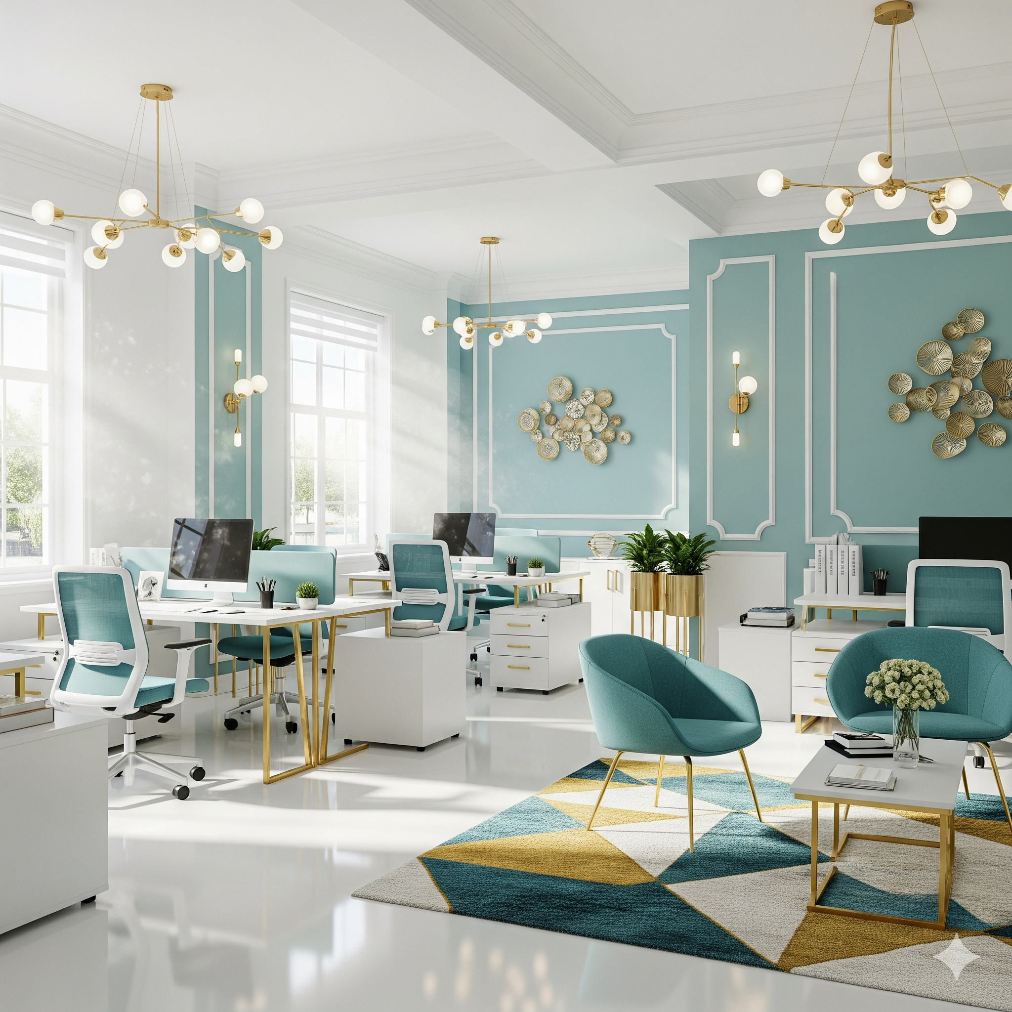 A modern office space with teal accent walls, white desks, teal chairs, and gold light fixtures and accents, and a geometric rug.